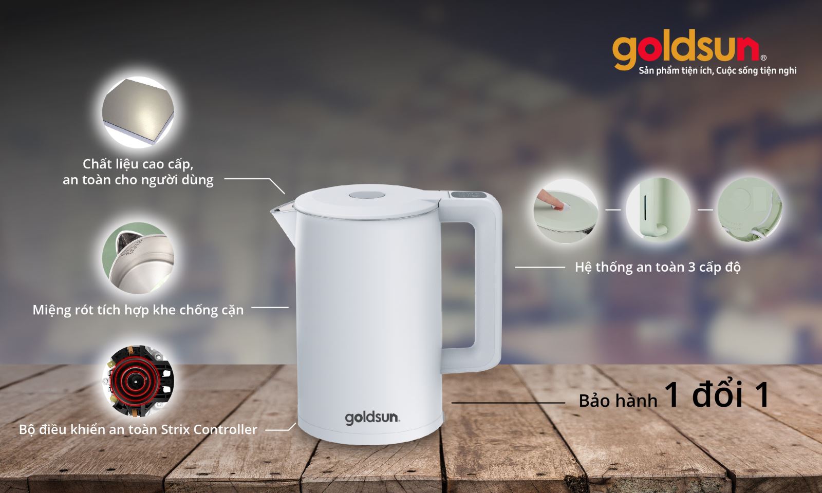 Với các chế độ bảo vệ an toàn khi sử dụng của ấm siêu tốc Goldsun như: bảo vệ quá tải nhiệt, tự động ngắt khi nước sôi và bảo vệ đun khô/không có nước. Ấm siêu tốc Goldsun luôn đem lại sự an tâm tuyệt đối của khách hàng khi sử dụng sản phẩm. Thân vỏ của ấm siêu tốc với các lớp vật liệu cách nhiệt giúp bảo vệ người sử dụng không bị bỏng khi chạm vào bình.