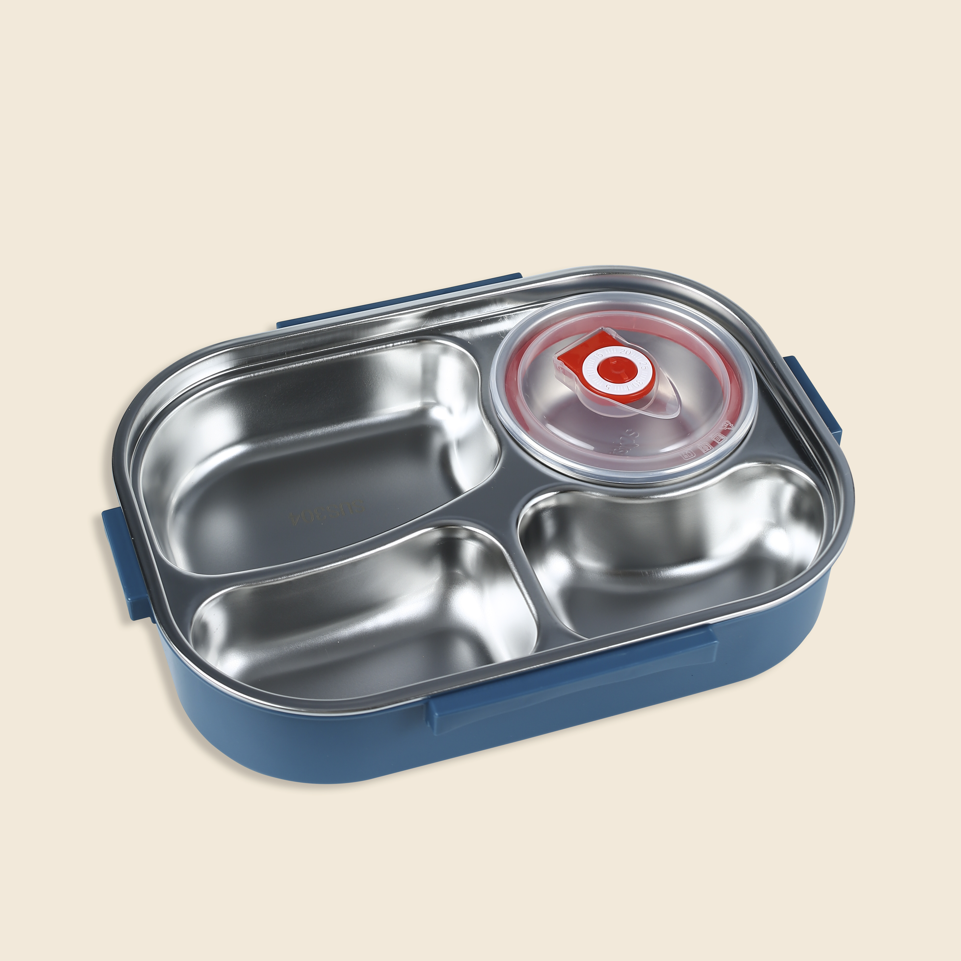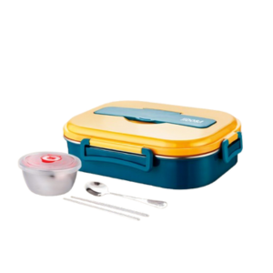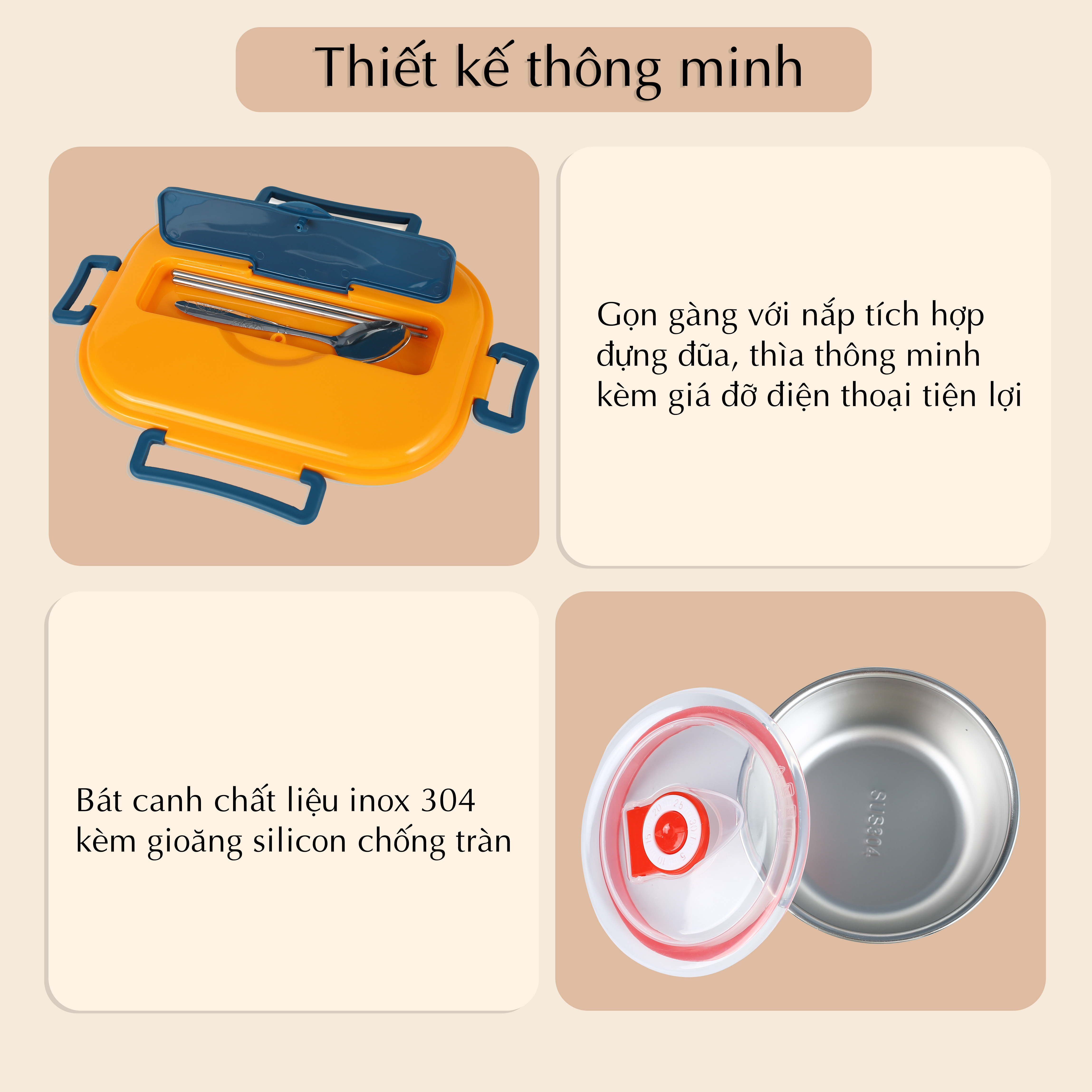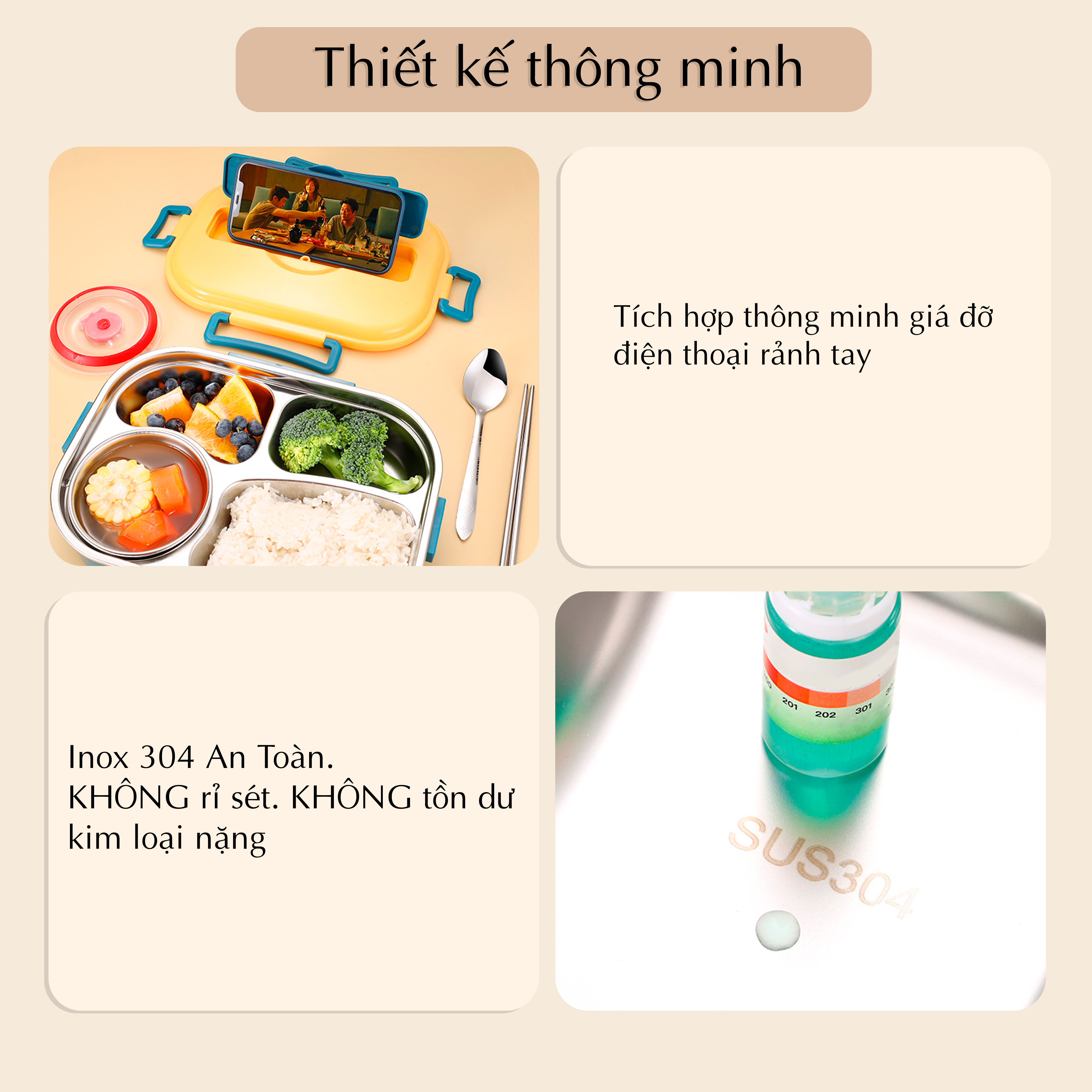 - Bộ hộp cơm giữ nhiệt bao gồm: 1 nắp và vỏ nhựa PP 05, 1 khay inox 304 - bốn ngăn, 1 bát canh inox 304 bọc nhựa chống nóng