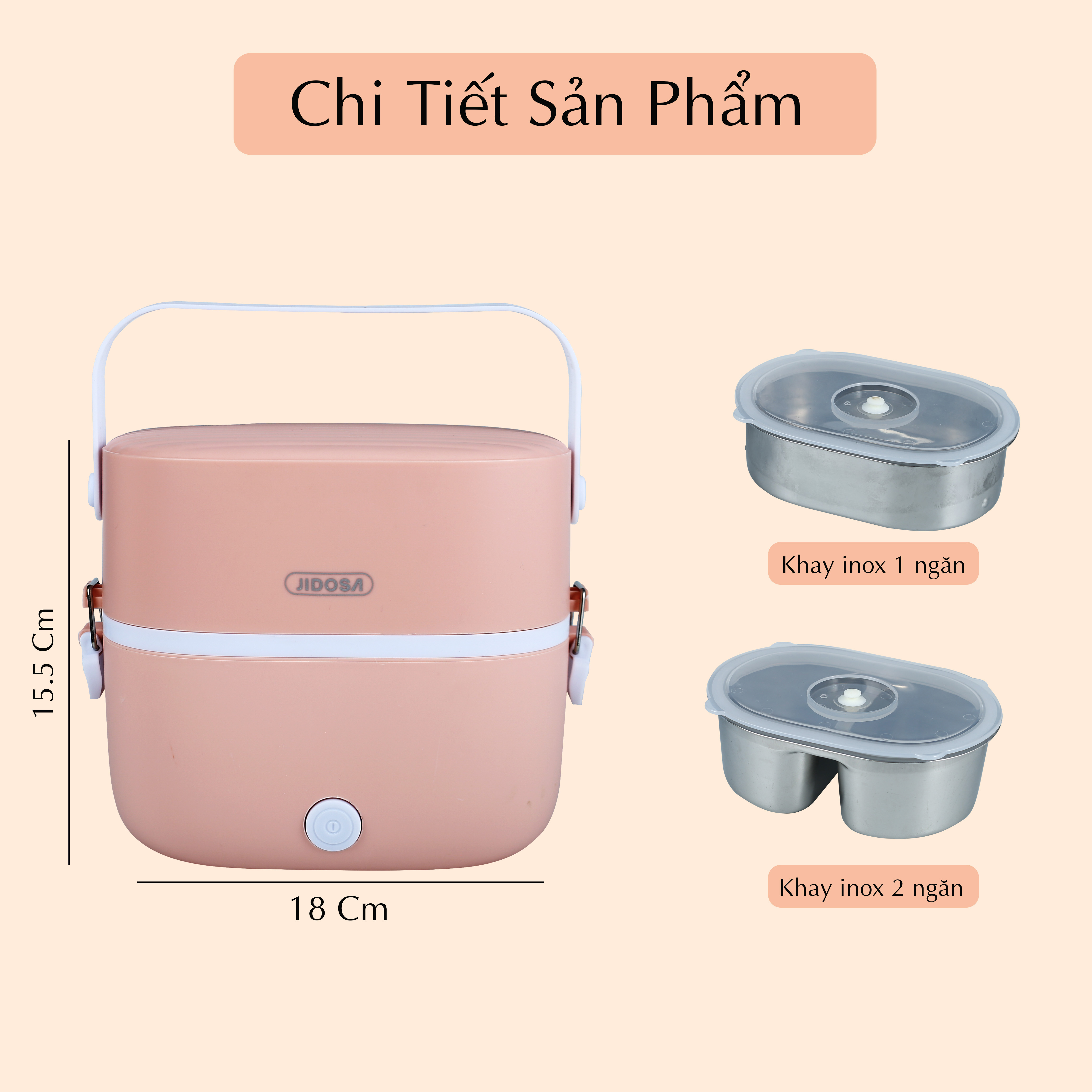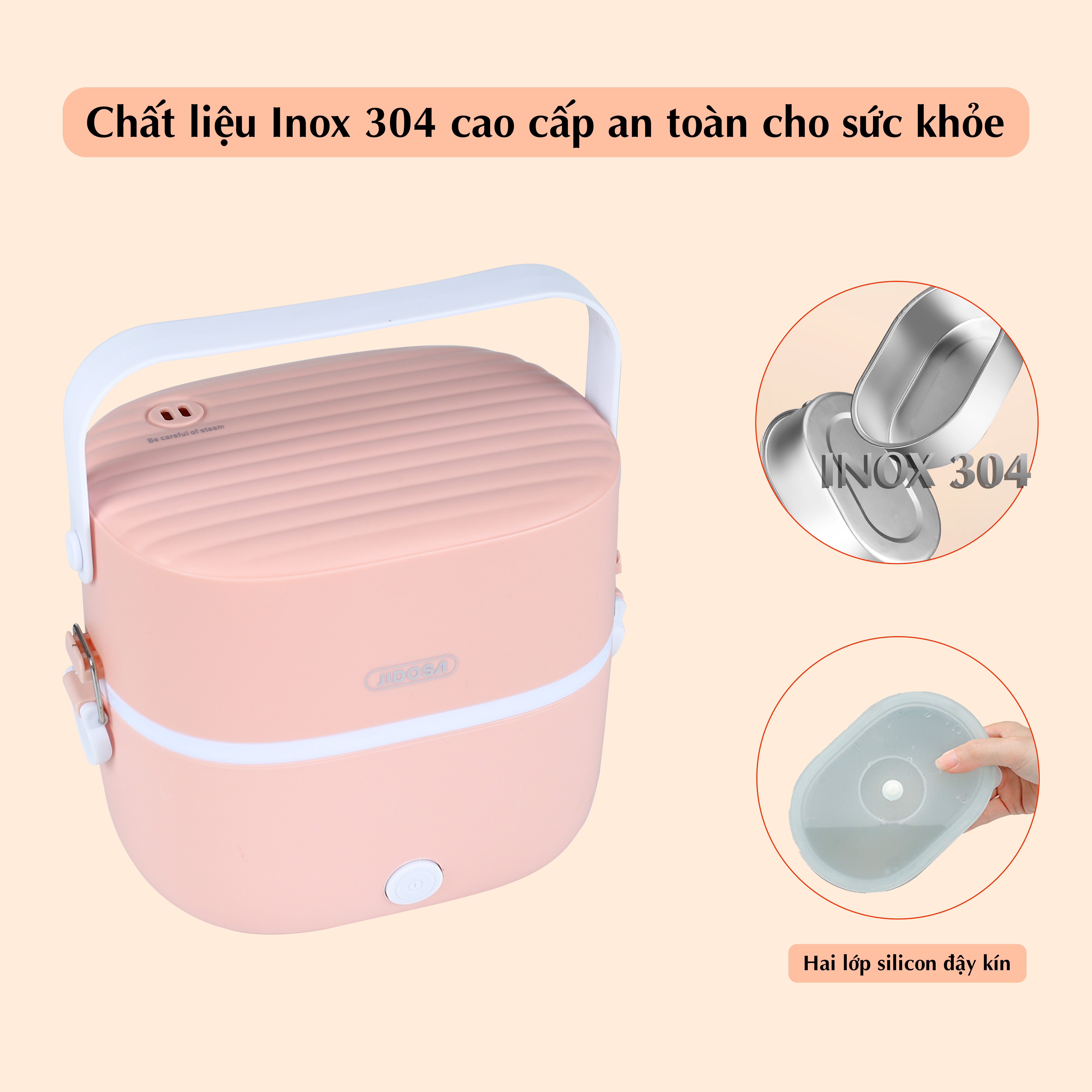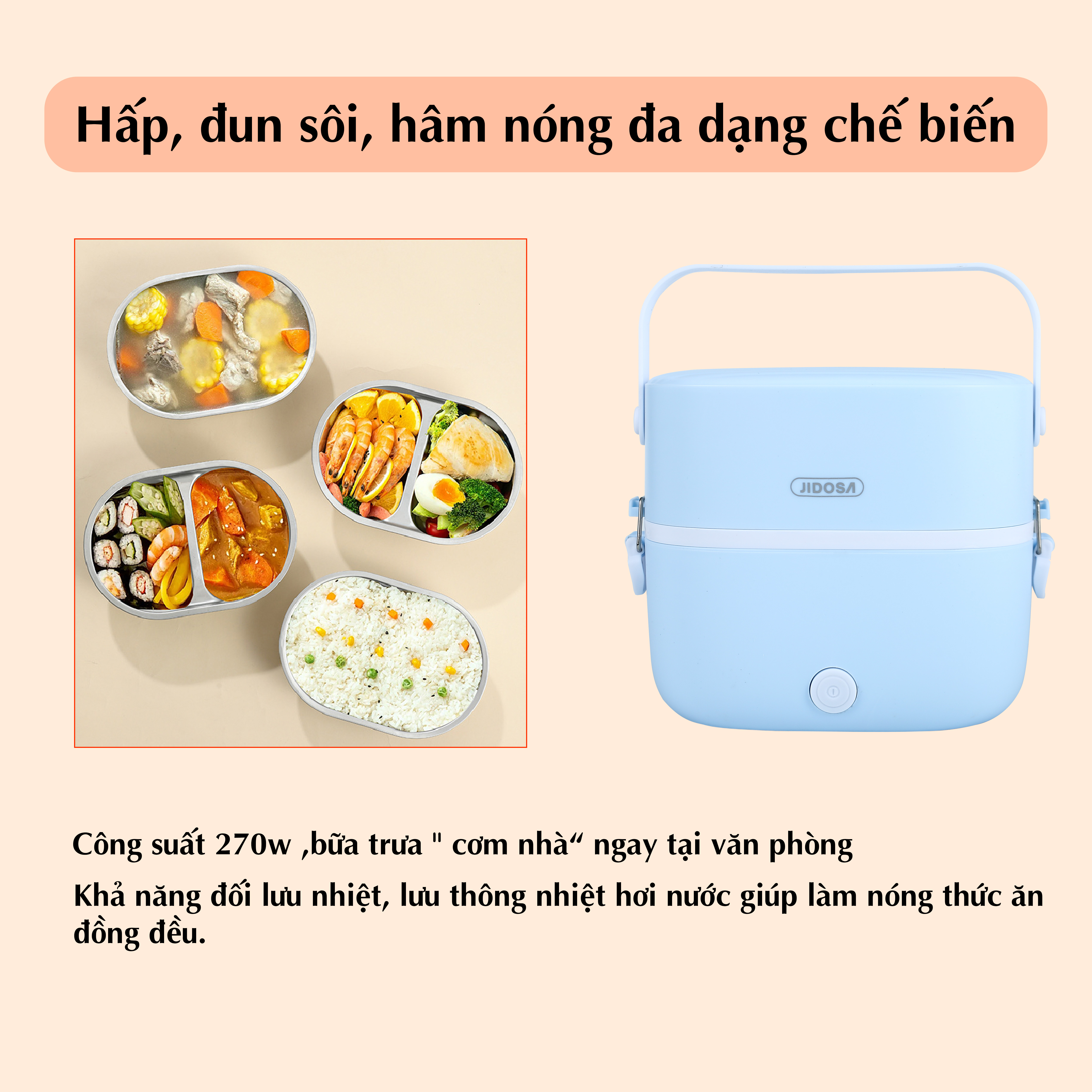 Hộp cơm cắm điện văn phòng JIDOSA JD3860 2 khay inox dung tích 1L giữ nhiệt, hâm nóng và tự nấu chín đa năng nhiều màu