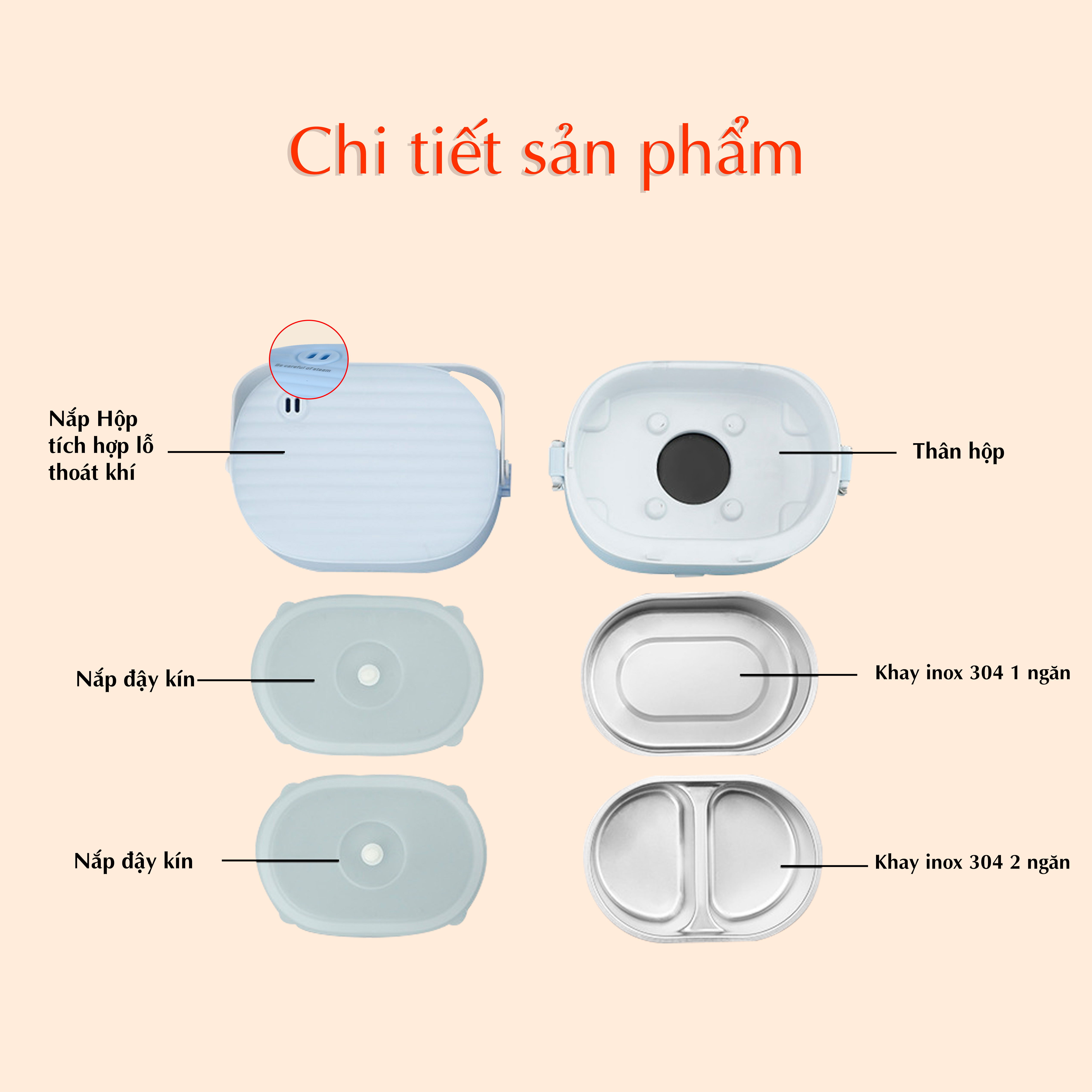 + Khay đựng thực phẩm nắp đậy có thể tháo rời để vệ sinh dễ dàng