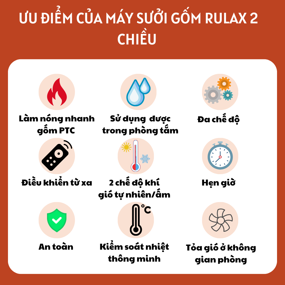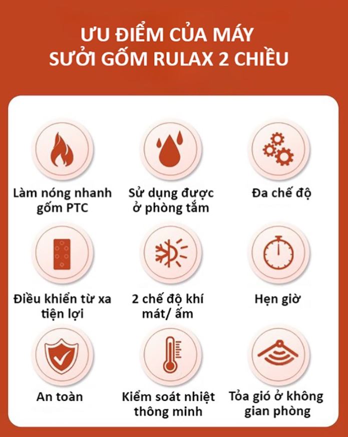 - Máy sưởi gốm RULAX có điều khiển từ xa linh hoạt, tiện dụng cho người sử dụng.